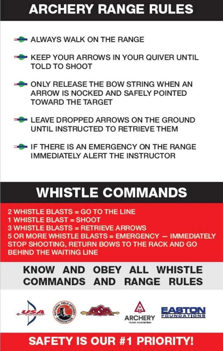 5 OR MORE WHISTLE BLASTS: Emergency! Immediately stop shooting. Return bows to eh rack and go behind the waiting line.